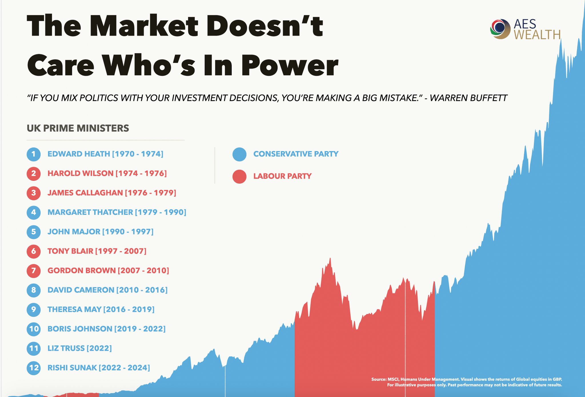 This graph demonstrates the performance of the market over the terms of various UK Prime Ministers, both from the Conservative and Labour parties. Despite the changes in political leadership, the market continues to grow. Don’t let political changes sway your investment strategy.